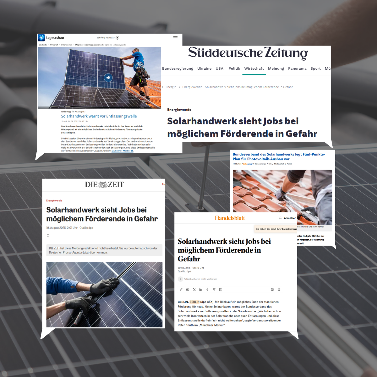 Für das inzwischen etablierte Solarhandwerk ist die Fortführung der Energiewende essenziell. Die geplante Abschaffung der Einspeisevergütung für kleine PV-Anlagen ohne eine verlässliche Nachfolgeregelung für alternative Geschäftsmodelle für den ins öffentliche Stromnetz eingespeisten Solarstrom stellt eine ernsthafte Bedrohung für über 100.000 Arbeitsplätze im Solarhandwerk dar. Diese Fachkräfte leisten täglich einen wichtigen Beitrag zur Umsetzung der Energiewende in Deutschland.